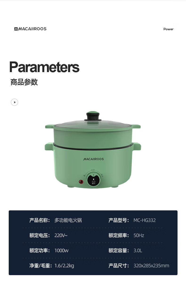 商品名称:迈卡罗电煮锅火锅家用多功能电锅 MC-HG332(带蒸笼) MC-HG339(红色不带蒸笼)